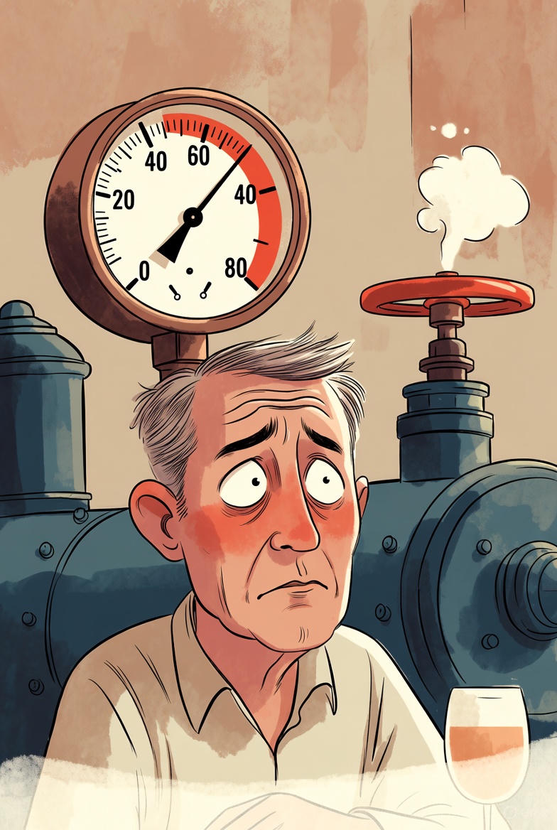 Cartoon: Man with red face sitting in front of a pressure gauge and a wine glass