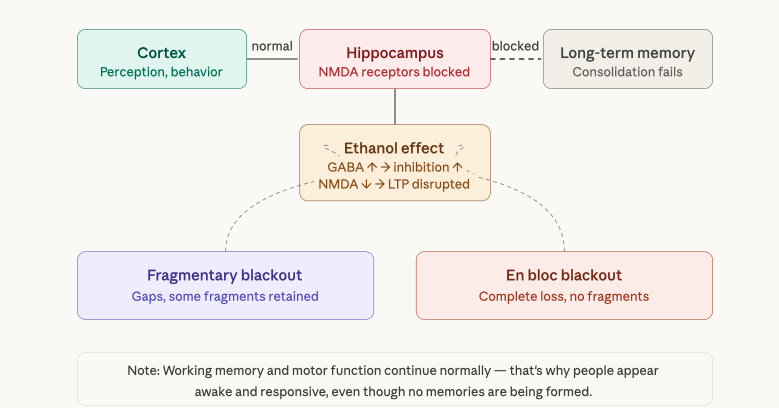 A blackout is not merely a curious phenomenon — it signals that the brain was in a state where actions were still possible, but no self-regulation through memory was taking place. People in this state can make decisions they will have no recollection of afterward — not because they are being dishonest, but because the memory was simply never formed.